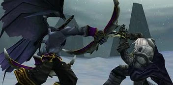Arthas fighting Illidan at the base of Icecrown Glacier.